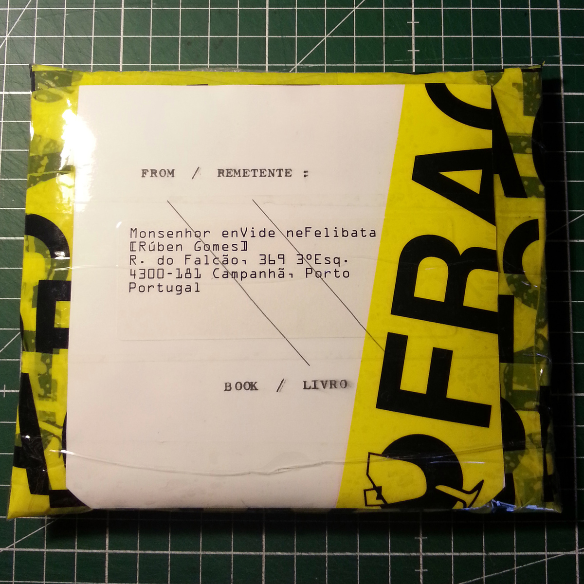I received my parcel with a cutout window revealing the stamps which have been franked! So now it appears the book travelled naked through the post! Thank You very, very much Rúben!